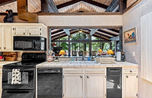 The living room is complete with a big-screen television, a stone-stacked fireplace, and floor-to-ceiling windows to view the lake from the comfort of the couch. Meal prep is a breeze in the fully-equipped kitchen and can be served at the six-person table. A grill is also available.