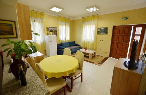 Private bathroom, living room with kitchen, small terrace in front of the house. This house offer you 4 different private apartments to rent. It is located close to center of Žminj, next to the road and Plodine supermarket. All apartments have wi fi, air condition, kitchen and there is also large parking in front of the house. Pets are welcome